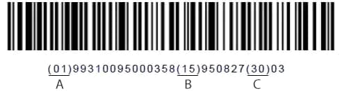 - K oddělení požadovaných údajů, jako je hmotnost nebo datum spotřeby, je přidán „aplikační identifikátor (AI)“, za nímž následují data. Pokud je vyjádřeno více údajů než jeden, musí s ním být spojen každý z nich.