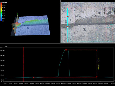 Digitální 4K mikroskop společnosti KEYENCE umožňuje provádět kvantitativní měření a kontroly i v případě mikroskopických otřepů, které vznikají, když část roztaveného plastu unikne z nepatrné mezery v dělicí linii v důsledku zakřivené formy nebo nedostatečné síly při jejím upnutí. Pořízení podrobných trojrozměrných informací o vadném dílu může rovněž přispět k rychlému odhalení příčiny, což umožní hledání preventivních opatření.