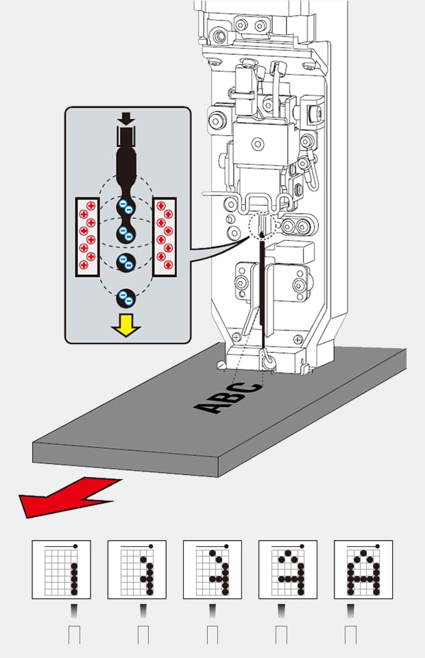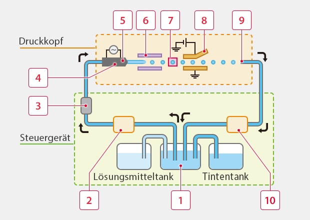 Wenn gedruckt wird, zerfällt die Tinte in viele winzige Tröpfchen. Einige dieser Tröpfchen bekommen in der Düse eine elektrische Ladung. In einem elektrischen Feld werden geladene Tröpfchen nach oben oder unten abgelenkt, so entsteht die Höhe der Zeichen (die Y-Richtung). Gleichzeitig bewegt sich entweder das Produkt unter der Düse vorbei oder der Druckkopf fährt seitlich, so entsteht die Breite der Zeichen (die X-Richtung).