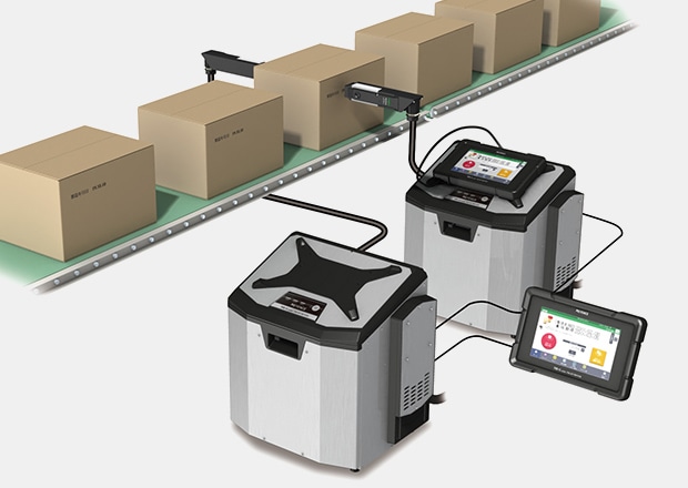 Einfache Installation auf einem Kartonverschließer. Die Möglichkeit, den Zeichenabstand nach Wunsch anzupassen, gewährleistet eine reibungslose Prüfung mit Bildinspektionssystemen.