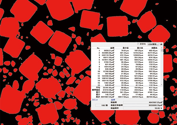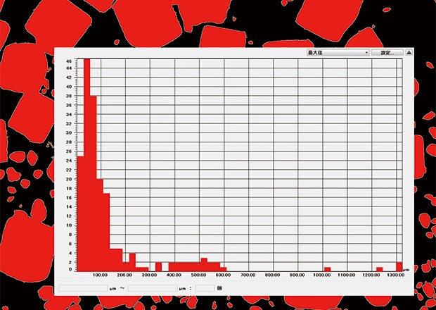 Mithilfe der automatischen Messfunktion lassen sich auf einfache Weise die Fläche, die Korngröße von Kristallen und die Kornanzahl in einem bestimmten Bereich messen. Darüber hinaus können Messergebnisse binär verarbeitet, in einer Liste und einem Histogramm angezeigt und als Bericht ausgegeben werden, was mit einfacher, intuitiver Bedienung und mit nur einem System möglich ist.