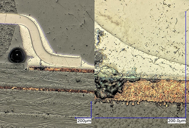 Querschnitt eines Ball Grid Arrays (BGA): Betrachtung eines Durchgangsdefekts aufgrund einer gerissenen Lotkugel (links: 200x / rechts: 500x)