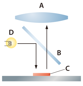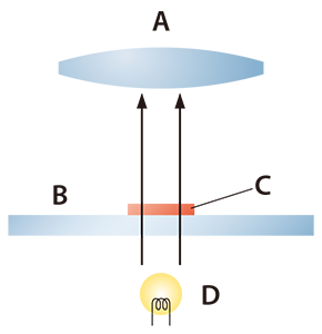 A : Linse  B : Glasplatte  C : Objekt  D : Lichtquelle