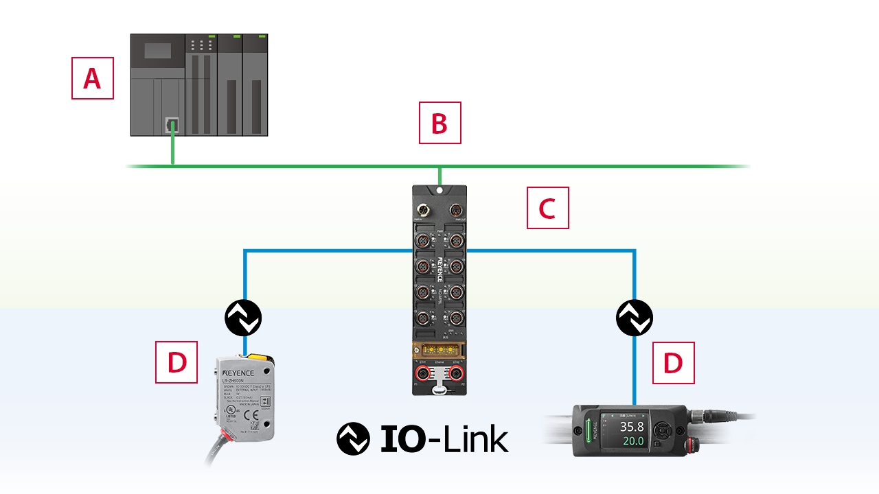 A: SPS usw. B: Feldnetzwerk/industrielles Netzwerk C: IO-Link Master D: IO-Link Devices (Sensoren/Aktoren)
