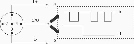 a: 24 VDC (max. 200 mA) b: 0V c: IO.Link-Modus d: Standard-I/O-Modus