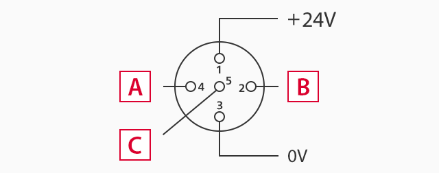 A: IO-Link-Kommunikation oder Digitaleingang B: Zusätzliche +24 V C: Zusätzliche 0 V