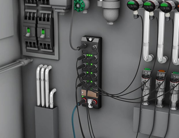 IO-Link Master sind Geräte, die mehrere IO-Link kompatible Geräte wie Sensoren und Aktoren verbinden können. IO-Link kompatible Geräte werden in der Regel mit ungeschirmten drei- oder fünfadrigen Kabeln angeschlossen, wobei jedes Kabel auf bis zu 20 m verlängert werden kann.