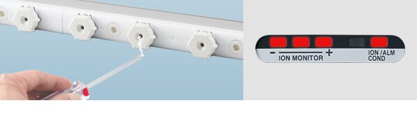 Die Entladungsstäbe der Modellreihe SJ-HA haben eine integrierte Selbstdiagnosefunktion, welche kontinuierlich die erzeugte Ionenmenge überwacht. Mit der Balken-LED und den Alarmfunktionen zeigt Ihnen der Ionisator an, wann eine Wartung erforderlich ist.