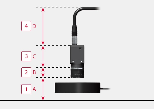 Der gesamte Installationsraum einer Kamera setzt sich zusammen aus A: Arbeitsabstand (Entfernung zwischen Objektivvorderkante und Werkstück) B: Objektivgröße C: Kameragröße und D: Kabelbereich, einschließlich Biegungen.