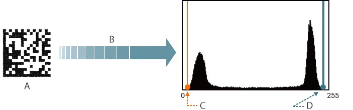ISO/IEC 15415 verwendet einen Grenzwert, der zwischen der niedrigsten und höchsten Intensität des Symbols liegt.