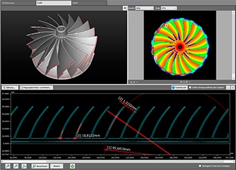 Die 3D-Daten können in jede beliebige Richtung gedreht werden, wodurch bestimmte Bereiche gemessen werden können, wie z. B. die Steigung und die gekrümmten Formen von Impellerschaufeln. Außerdem können Längs- und Querschnitte gemessen werden, ohne das Werkstück zu zerstören.