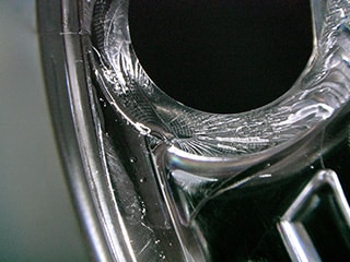 Mögliche Ursachen: Niedrige Temperatur des eingespritzten geschmolzenen Kunststoffs oder langsame Einspritzgeschwindigkeit während des Spritzgießens, was zu einer geringen Fließfähigkeit des Kunststoffs in der Form führt. Die Schlieren entstehen durch Überlappung von Kunststoff in der Form mit nachfolgendem Kunststoff. - Rissbildung und Haarrisse