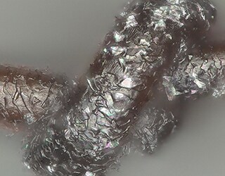Mit dem Digitalmikroskop der Modellreihe VHX kann der optische Schatteneffekt-Modus verwendet werden. Durch die Beleuchtungsvariation lassen sich mithilfe der entstandenen Kontrastunterschiede kleinste Unregelmäßigkeiten auf der Oberfläche, wie z. B. der Haarkutikula, erkennen. Die Echtfarbeninformationen werden über der Aufnahme im optischen Schatteneffekt-Modus eingeblendet, um die gleichzeitige Darstellung ungleichmäßiger Oberflächen- und Echtfarbeninformationen zu ermöglichen. Die Darstellung einer unebenen Oberfläche mit Höhenfarben erleichtert die Auswertung durch den Anwender.