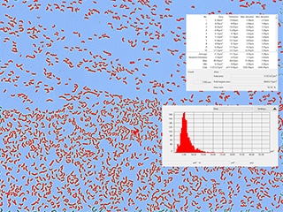 Im ausgewählten Bereich können nicht benötigte Messobjekte ausgeschlossen, überlappende Messobjekte getrennt und Messobjekte mit beliebigen Schwellenwerten binarisiert werden, was eine präzise Analyse und quantitative Auswertung auf einfache Weise ermöglicht.