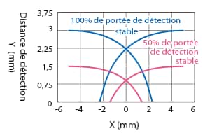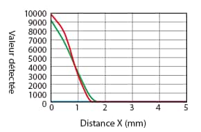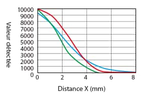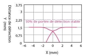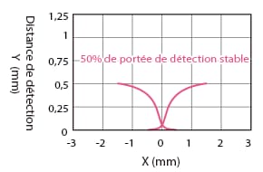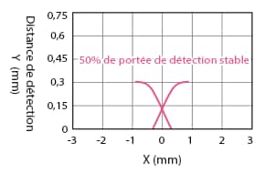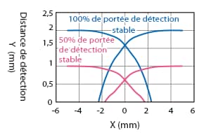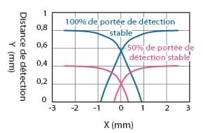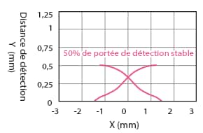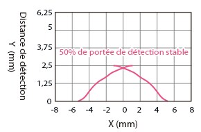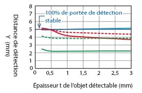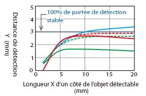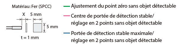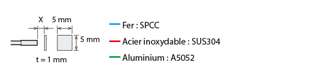 Taille de l’objet détectable : 5 mm × 5 mm, Épaisseur t = 1 mm (taille standard de l’objet détectable), Mode normal