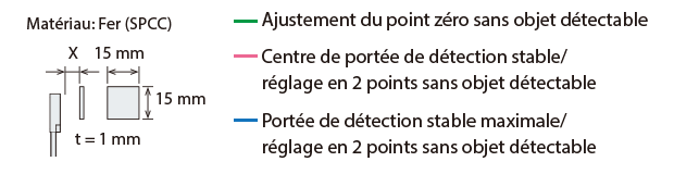 Taille de l’objet détectable : 15 mm × 15 mm, Épaisseur t = 1 mm (taille standard de l’objet détectable), Mode normal
