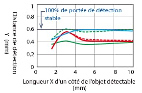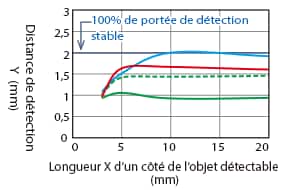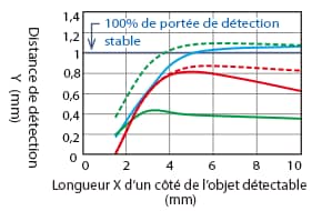 Taille de l’objet détectable : 10 mm × 10 mm, Épaisseur t = 1 mm (taille standard de l’objet détectable), Mode normal