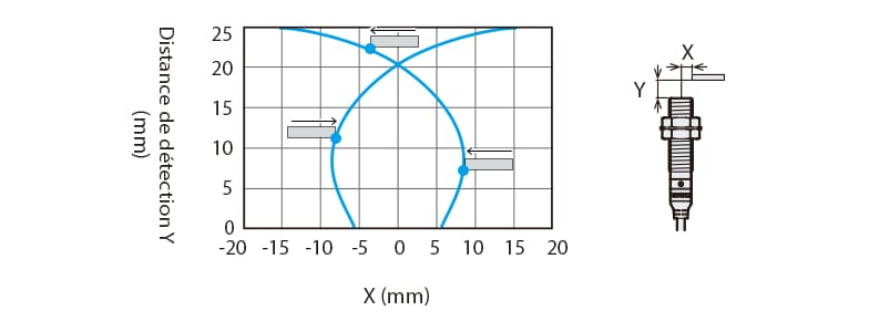 La figure suivante montre la position du point ON quand l’objet détectable standard (spécifié dans les caractéristiques) est déplacé parallèlement au capteur dans le sens de la flèche.