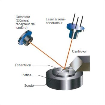 Le microscope à force atomique mesure l'aspérité d'un échantillon en utilisant les forces atomique entre la pointe et l'échantillon. Pour réaliser la mesure, l'utilisateur déplace le cantilever, doté d'une pointe (sonde) à son extrémité, à proximité de la surface d'un échantillon à une distance de plusieurs nanomètres. De façon à maintenir une force constante entre la pointe et l'échantillon (une déformation constante du cantilever), le microscope à force atomique fournit un retour au scanner piézoélectrique pendant le balayage.