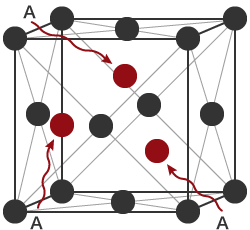 Après la trempe, la structure lamellaire devient cubique à faces centrées et les atomes sont alors situés dans chaque coin et au centre des faces du cube. Dans cette structure, le carbone devient soluble.