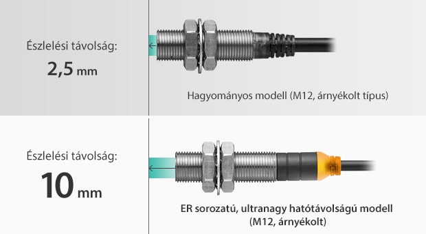 Az ER sorozat ultranagy tartományú érzékelést tesz lehetővé, így az érzékelő a céltárgytól távolabb telepíthető, jelentősen csökkentve az ütésekből és kopásból eredő károk kockázatát. Ezzel egyúttal megelőzi a rezgésből vagy a helytelen beállításból eredő téves érzékeléseket is. Az új Impulzusoszcilláció és Kettős tekercses érzékelési módszer lehetővé teszi a síkba történő rögzítést és a nagy tartományú érzékelést anélkül, hogy a környező fém interferenciát okozna.