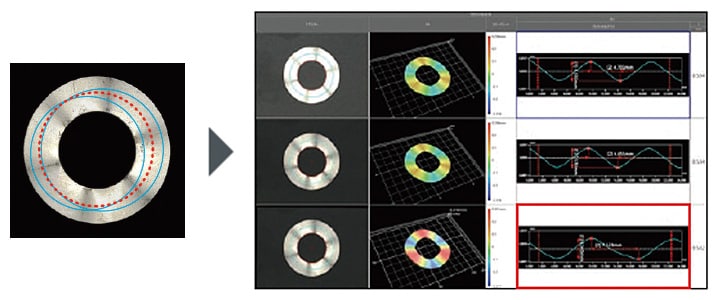 Mivel a célmagasság színekben jeleníthető meg, a profilmérés pedig a céltárgy bármely részén lehetséges, így lehetőség nyílik az alakhibák helyeinek és pontos számértékeinek megjelenítésére és azonosítására. Ez lehetővé teszi az öntőformák, szerszámok és formázási körülmények okozta hibák okainak zökkenőmentes azonosítását és kijavítását.