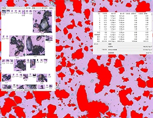 Az automatikus területmérés/-részecskeszámlálás funkcióval a készített kép bármely pontján zökkenőmentes automatikus részecskeméréseket és -elemzéseket végezhet. Ez a funkció nemcsak pontosan megszámolja a részecskéket, hanem automatikusan megméri és kiszámítja az olyan mikrométernél kisebb részletes értékeket, mint a köralakúság, a maximális- és minimális átmérő, a konvexitás vagy a szilárdság. Továbbá az értékek átlagát, szórását, maximumját, minimumját, és összesítését is megadja. Sőt, ezt követően az értékeket egy listában is megjeleníti.