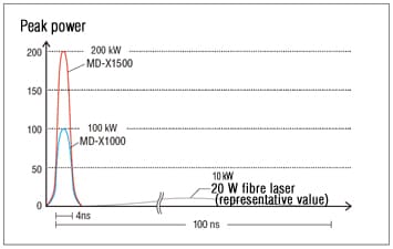 The MD-X1500 Series achieves a peak power of 200 kW, which is approximately twice the peak power of conventional YVO4 lasers. The MD-X1500 Series combines a high peak power with a short pulse width (4 ns) to minimise the damage caused by heat transfer to the target. This makes the MD-X1500 Series the optimal laser marker for applications where it is necessary to eliminate the effect of heat transfer such as marking on resins or plastics.