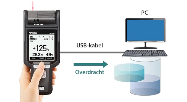 Er kunnen maximaal 100 meetgegevens worden opgeslagen in het interne buffergeheugen van de sensor. Opgenomen gegevens kunnen via een USB-kabel worden overgedragen naar een pc, waar ze kunnen worden opgeslagen in een CSV-bestand.