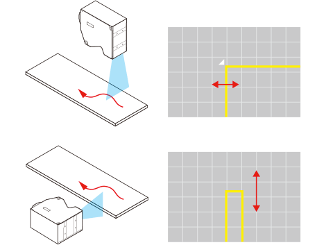 De laserlijn weerkaatst op het doel waardoor er een profiel ontstaat van waaruit de fluctuaties in de randpositie kunnen worden gevolgd. Deze meting kan van boven of van opzij van het doel worden uitgevoerd.