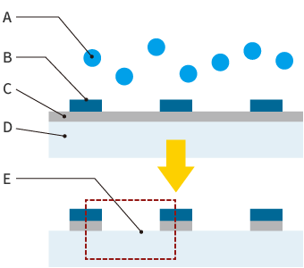 Bij de maskeropening wordt het object met dezelfde snelheid radiaal geëtst, zodat het gebied direct onder het masker wordt geboord (zij-etsen, ondersnijding).