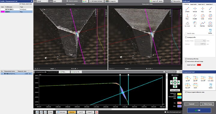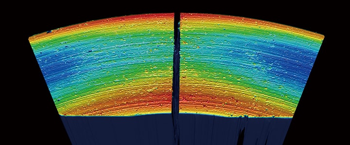 De VR-serie kan 3D-vormen van het voorwerp nauwkeurig en onmiddellijk meten door met hoge snelheid in 3D te scannen zonder het voorwerp aan te raken. Het lost alle problemen op van conventionele meetinstrumenten door een meting van de hoogste en laagste punten op het slijtoppervlak mogelijk te maken, evenals een meting van het volume, de dwarsdoorsnede en de verhouding van de oppervlakte tot de dwarsdoorsnede.