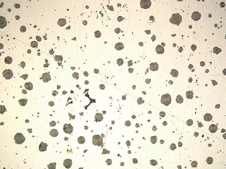 Bekijk na het polijsten van het monster het gepolijste oppervlak van dat monster met een microscoop. Vergroot de structuur en stel goed scherp om de veranderingen in de structuur door een warmtebehandeling goed te kunnen waarnemen. Gedetailleerde metingen, zoals metingen van ingesloten niet-metalen deeltjes, sferoïdisatie van grafiet en de verhouding ferriet/perliet, kunnen pas worden uitgevoerd na installatie van de specifieke software.