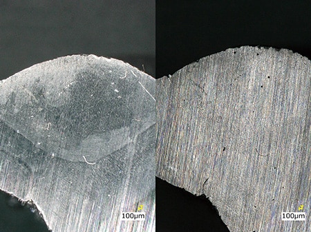 Met de 4K digitale microscoop uit de VHX-reeks kunnen dankzij de 4K-beelden met hoge resolutie de randen haarscherp in beeld worden gebracht. Zelfs voor de dwarsdoorsneden van een overlaplas, waar de grens tussen de las en het basismateriaal moeilijk is te zien, kunnen nu de grensranden, verschillen in metaalstructuren en delen met fouten haarscherp in beeld worden gebracht.