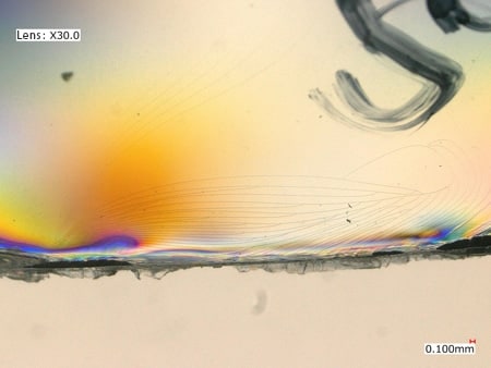 Waarneming met doorvallende gepolariseerde verlichting visualiseert restspanning, vreemde deeltjes en barstjes.