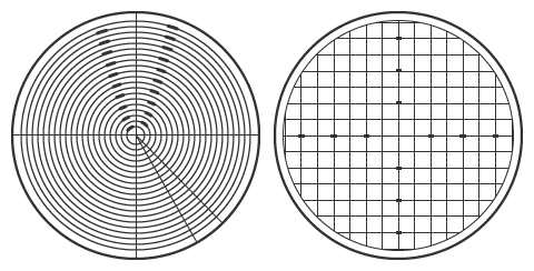 For measuring the diameter and radius, there are concentric circle marks, for measuring angles, there are radial marks, and for both. In addition, some of the scales are written in a grid to see the XY coordinate values. Both are placed on the screen and measured by matching them with the projected image.