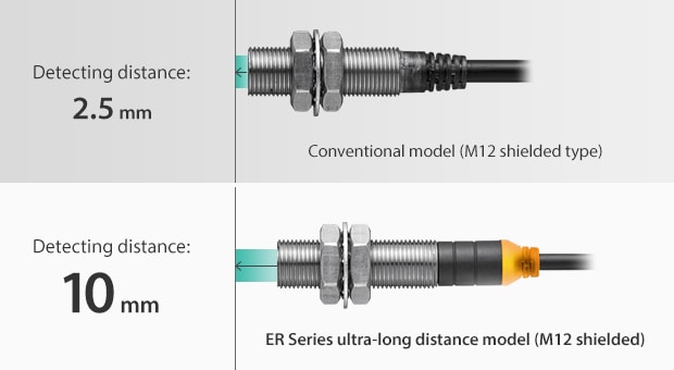 The ER Series enables ultra-long distance detection, allowing installation farther from the target, greatly reducing the risk of damage caused by impact and abrasion. It also prevents false detections caused by vibration or misalignment. The new Pulse oscillation + Dual-coil detection method enables flush metal mounting and long-distance detection without interference from surrounding metal.