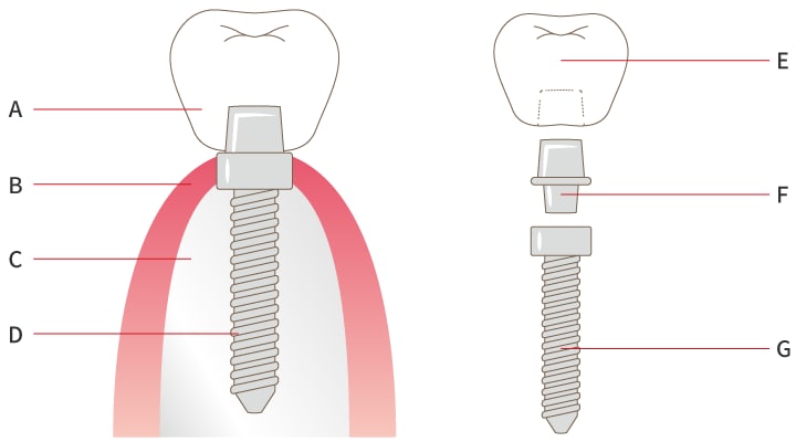 - Joint parts between artificial teeth and implants. Titanium has excellent strength, resistance to corrosion, and durability, but the appearance isn’t as good. Zirconia offers strength and no risk of metal allergy. Also, as the colour is close to that of natural teeth, the appearance is good.