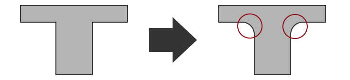 As previously stated, sink marks can be prevented by reducing thickness. However, there are some cases when the thickness cannot be changed. For example, sometimes thickness cannot be changed in order to maintain strength. In cases like this, you would want to change the shape so that wall thickness changes gradually. Looking at the example below, you can see how you can add rounded corners to resulting in a slight decrease in wall thickness.