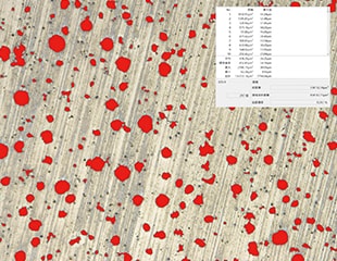 This automatic area measurement/count function allows for prompt automatic acquisition not only of the count and area of objects determined to be graphite nodules under specified conditions but also of a variety of data such as the total area; the total area ratio; and the maximum graphite diameter as well as its average, standard deviation, maximum value, and minimum value.