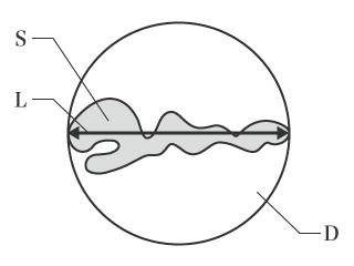 The roundness factor (R) used to evaluate graphite nodularity is determined by observing the graphite in the material as shown in the figure. L is the maximum diameter (long axis) of the graphite. S is the area of the graphite, and D is a circle with this maximum diameter used for its diameter. Dividing the area of S by the area of D gives the roundness factor.