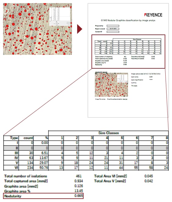 The following image shows an example of using a single VHX Series to acquire a graphite observation image and the analysis data and output them to an Excel template. This example indicates how an ISO-compliant report containing roundness factor classifications (type) and size classes, nodule counts, various area measurement results, and graphite nodularity can be created automatically.