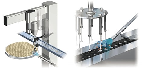 Pickup: lifting chips with a vacuum pickup tool after dicing.